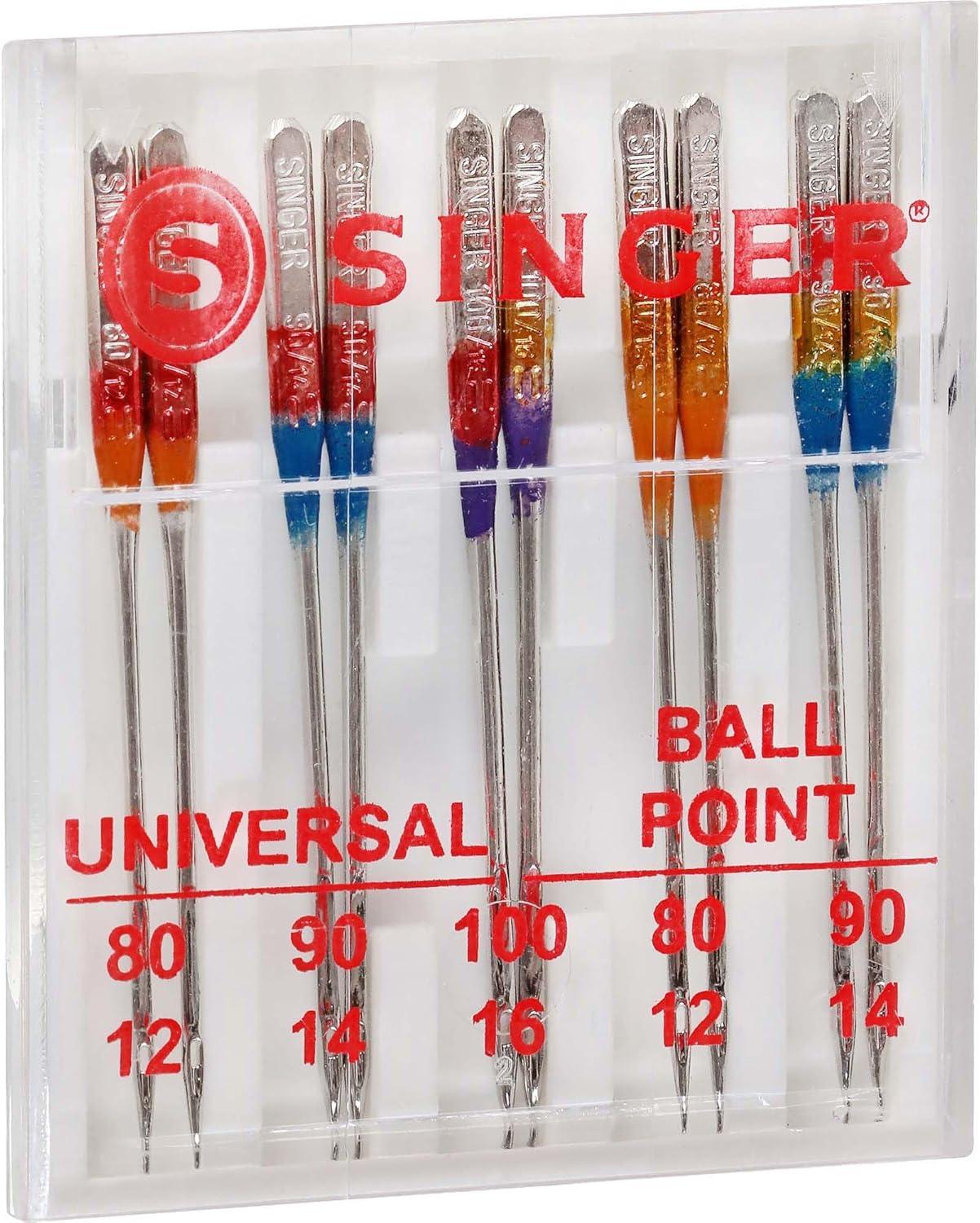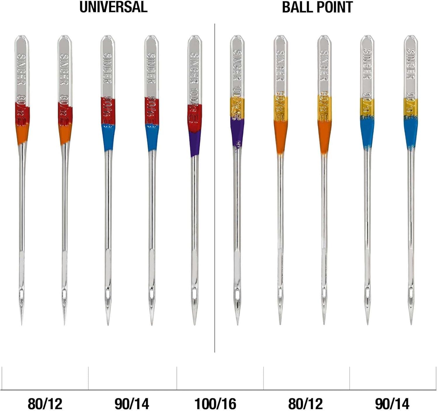 Sewing machine needle set comes with 5 universal regular point and 5 ball point type machine needles in assorted sizes