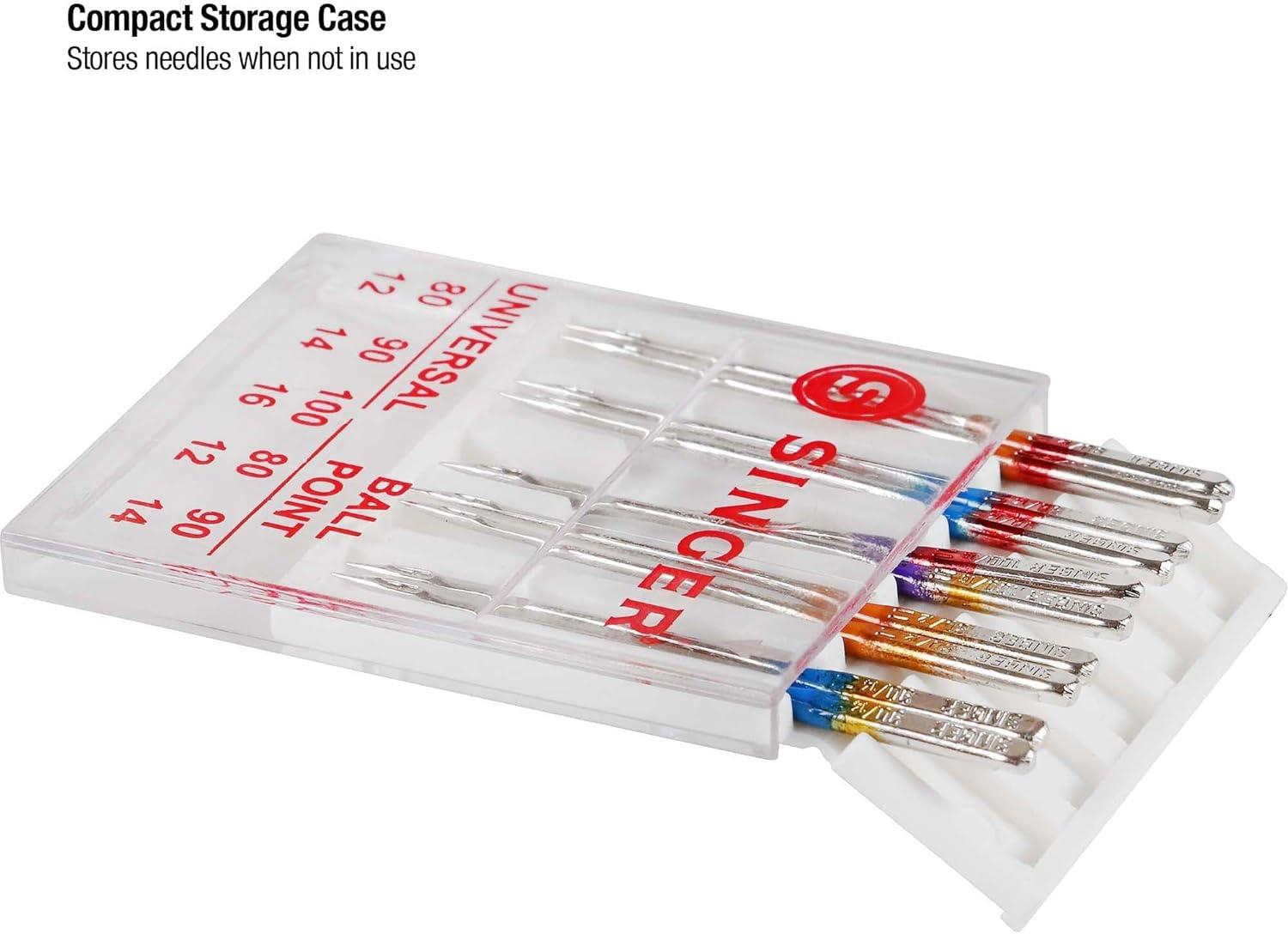 Includes 3 different sized machine needles to meet all your sewing machine needs: 2 – 80/12, 2 – 90/14, and 1 – 100/16 in both needle types for a total of 10